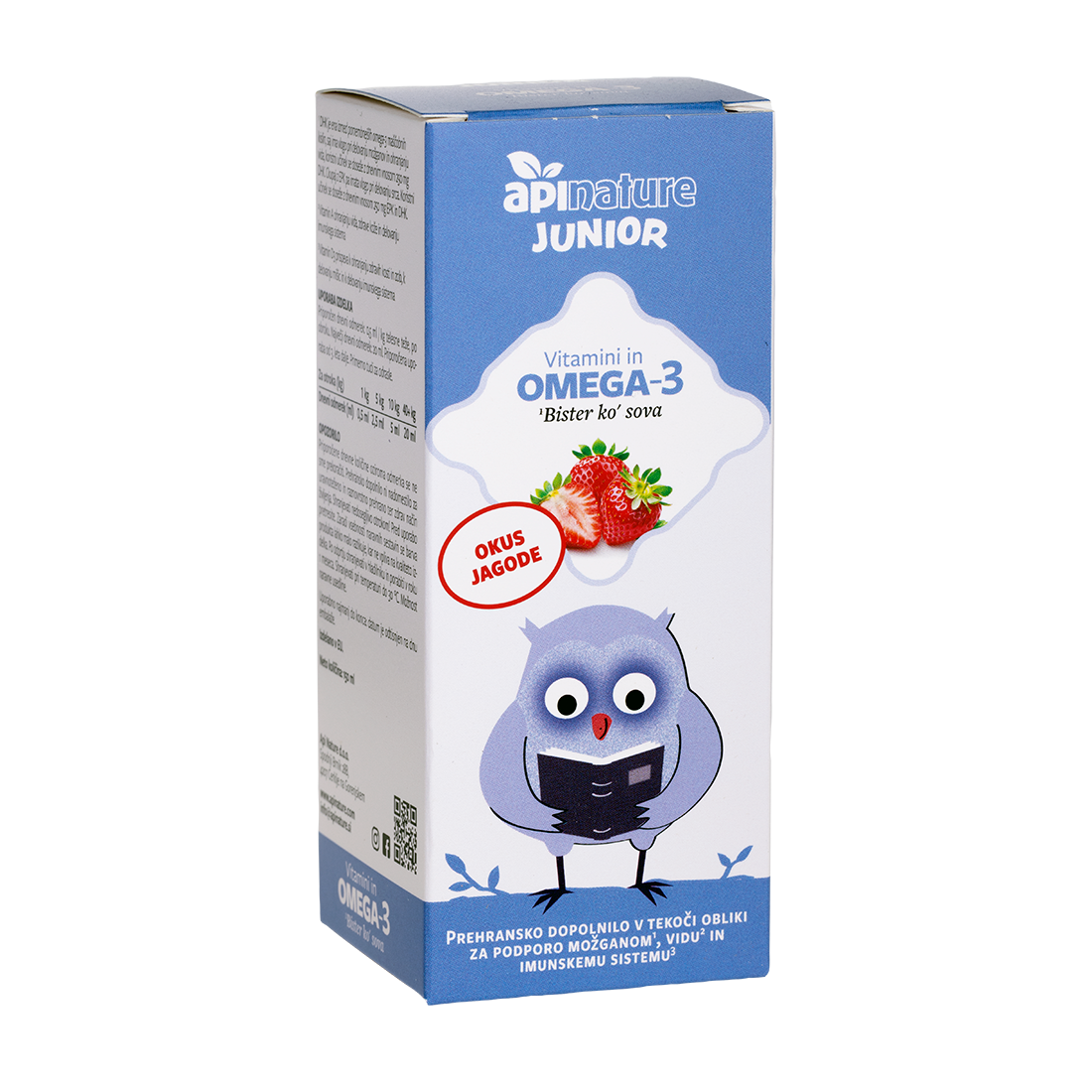 Apinature JUNIOR OMEGA 3 in VITAMINI – Prehransko dopolnilo v tekoči obliki za podporo možganom1, vidu2 in imunskemu sistemu3
