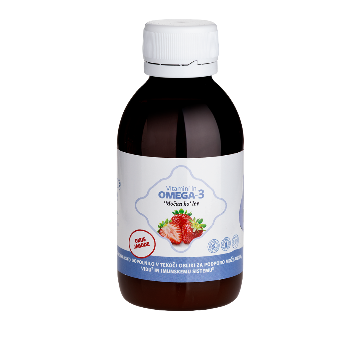 Omega-3 maščobne kisline so esencialne maščobne kisline, ki jih naše telo ni zmožno samo proizvajati, zato jih moramo zaužiti s hrano. Najdemo jih predvsem v mastnih ribah (sardele, skuša, tuna, losos …), oreščkih, nekateri zelenjavi in podobno. OMEGA 3 – Tekoče prehransko dopolnilo za otroke je odlična izbira, da vašemu otroku vsakodnevno priskrbite za telo zelo pomembne omega-3 maščobne kisline. Vsebuje patentirano sestavino Omegavie® 25, ki je standardizirana na: