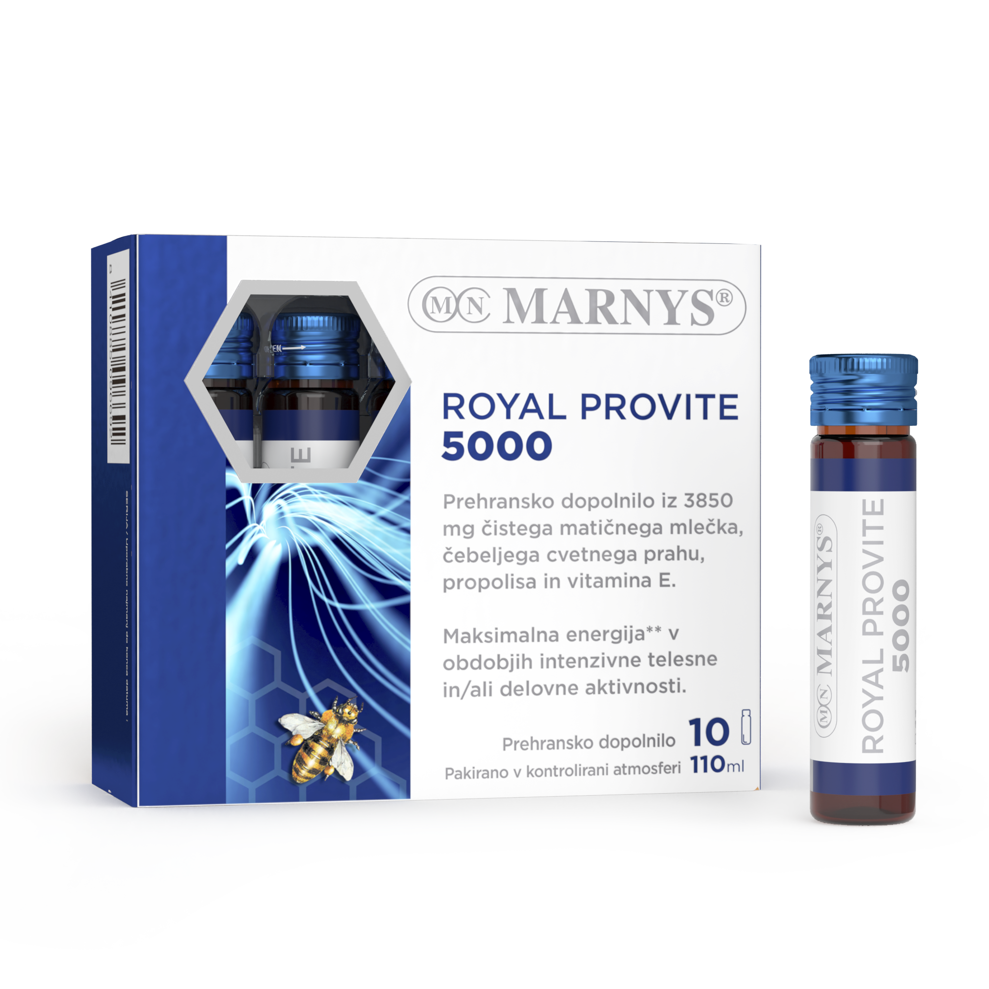 MARNYS® Royal Provite 5000 je prehransko dopolnilo, ki zagotavlja *energijo v obdobjih intenzivne telesne in/ali delovne aktivnosti. Vsebuje najvišjo koncentracijo čistega matičnega mlečka na trgu s 3850 mg na vialo. Zaradi oblike, primerne za pitje z enim odmerkom, je idealen za priročno, enostavno in hitro uživanje.